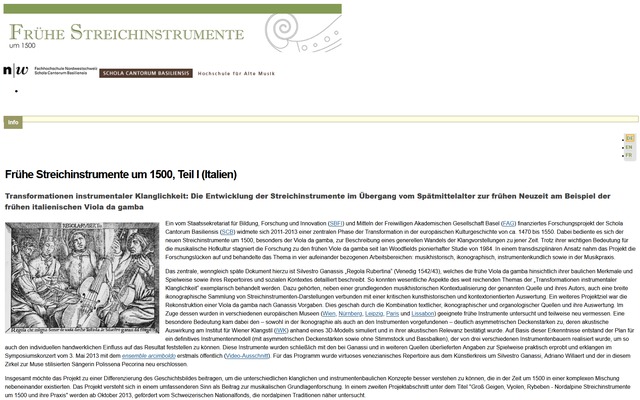 Ein vom Staatssekretariat für Bildung, Forschung und Innovation (SBFI) und Mitteln der Freiwilligen Akademischen Gesellschaft Basel (FAG) finanziertes Forschungsprojekt der Schola Cantorum Basiliensis (SCB) widmete sich 2011-2013 einer zentralen Phase der Transformation in der europäischen Kulturgeschichte von ca. 1470 bis 1550. Dabei bediente es sich der neuen Streichinstrumente um 1500, besonders der Viola da gamba, zur Beschreibung eines generellen Wandels der Klangvorstellungen zu jener Zeit. Trotz ihrer wichtigen Bedeutung für die musikalische Hofkultur stagniert die Forschung zu den frühen Viole da gamba seit Ian Woodfields pionierhafter Studie von 1984. In einem transdisziplinären Ansatz nahm das Projekt die Forschungslücken auf und behandelte das Thema in vier aufeinander bezogenen Arbeitsbereichen: musikhistorisch, ikonographisch, instrumentenkundlich sowie in der Musikpraxis.